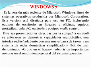 Este documento describe las características principales de Windows 7, incluyendo mejoras en la interfaz multitáctil, compatibilidad con versiones de 32 y 64 bits, un modo que permite ejecutar Windows XP de forma virtualizada, y nuevas funciones como Aero Peek, Aero Shake, Aero Snap y Jump Lists. También resume el desarrollo de Windows 7 y algunas de sus características clave como mejoras en el rendimiento y soporte para tarjetas gráficas múltiples.