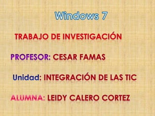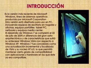 Windows 7 es la versión más reciente del sistema operativo de Microsoft. Fue diseñado como una actualización de Windows Vista enfocada en mejorar el rendimiento, la compatibilidad y la interfaz de usuario. Incluye características como mejoras en el reconocimiento de escritura, soporte para discos duros virtuales y una interfaz rediseñada. Fue lanzado en 2009 y recibió revisiones positivas por ser más fácil de usar que su predecesor.