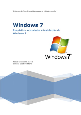 Este documento describe los requisitos, novedades e instalación de Windows 7. Explica que requiere un procesador de 1 GHz o superior, 1-2 GB de RAM, y 16-20 GB de espacio en disco dependiendo de si es de 32 o 64 bits. Detalla seis ediciones pero solo se comercializan tres. Describe características nuevas como Aero Snaps, el modo XP, el hipervisor y mejoras a la interfaz como Aero Shake y las listas de tareas. Finalmente compara las novedades de Windows 7 frente a Vista y XP.