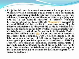 Windows 7 SP1 ya está disponible para su descarga e instalación de forma gratuita. Microsoft comenzó las pruebas de SP1 en julio de 2010 y lanzó la versión final el 9 de febrero de 2011, entregándola primero a socios OEM y luego haciéndola disponible para su descarga por usuarios de MSDN, TechNet y a través de Windows Update el 22 de febrero. SP1 incluye actualizaciones de seguridad, rendimiento y estabilidad, así como soporte para nuevas funciones de virtualización.
