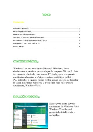Este documento describe las diferencias principales entre los sistemas operativos Windows 7 y Windows 8. Explica la evolución de Windows 7 desde su antecesor Windows Vista y resume sus características clave. También destaca las principales diferencias entre Windows 7 y 8, como la nueva interfaz diseñada para dispositivos táctiles y la tienda de aplicaciones en Windows 8.