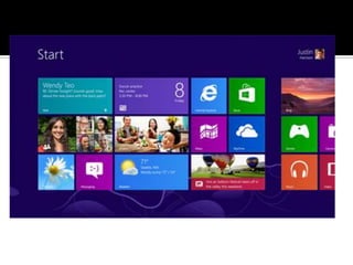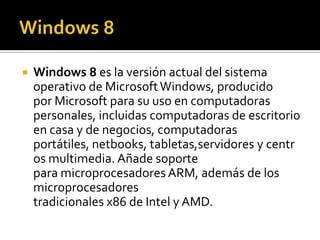 Windows 8 es la versión actual del sistema operativo de Microsoft para computadoras personales y dispositivos móviles. Introduce soporte para procesadores ARM además de x86 e incluye características como interfaz Ribbon, tienda de aplicaciones, sistema de archivos Protogon y compatibilidad con USB 3.0. Los requisitos de hardware son similares a Windows 7.