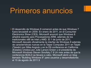 Windows 8 es un sistema operativo producido por Microsoft para computadoras personales y otros dispositivos. Introdujo soporte para procesadores ARM además de x86 e incluyó una interfaz renovada optimizada para pantallas táctiles. Microsoft lanzó varias versiones preliminares antes de la versión final publicada en octubre de 2012.