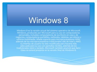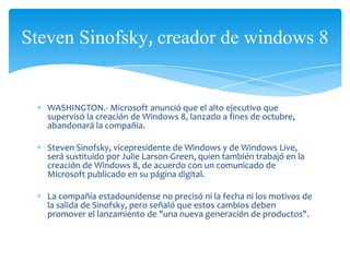 Windows 8 es la última versión del sistema operativo de Microsoft para computadoras personales y dispositivos móviles. Presenta una nueva interfaz diseñada para pantallas táctiles y soporte para procesadores ARM y x86. Steven Sinofsky, quien supervisó el desarrollo de Windows 8, abandonó repentinamente Microsoft y fue reemplazado.