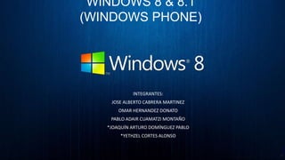 Este documento describe las versiones Windows 8, 8.1 y Windows Phone. Windows 8 fue diseñado por Bill Gates y lanzado en 2012 con una nueva pantalla de inicio y aplicaciones. Windows 8.1, lanzado posteriormente, incluyó mejoras como botones adicionales y opciones de personalización. El documento también cubre los requisitos técnicos, costos y características de Windows Phone.
