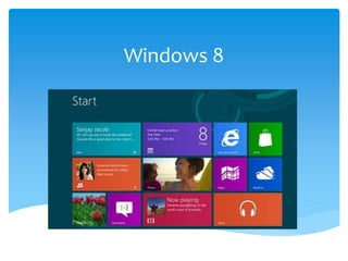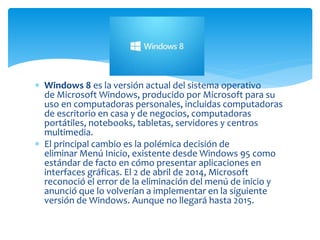 Windows 8 es la versión actual del sistema operativo de Microsoft para computadoras personales. Eliminó el Menú Inicio existente desde Windows 95 e introdujo una interfaz de usuario modificada para su uso con pantallas táctiles. Añade soporte para procesadores ARM y una nueva Tienda de Aplicaciones. Windows 7 es una versión anterior diseñada para uso en PC que incluye mejoras en el rendimiento, estabilidad y accesibilidad respecto a su predecesor Windows Vista.