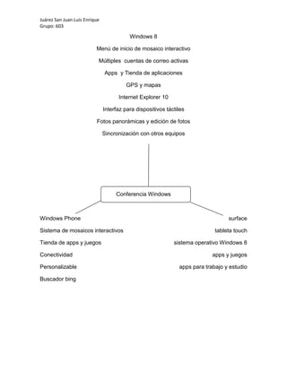 Este documento describe las características de Windows 8, incluyendo su menú de inicio de mosaico interactivo, la capacidad de tener múltiples cuentas de correo activas al mismo tiempo, una tienda de aplicaciones y apps, GPS y mapas, el navegador Internet Explorer 10, una interfaz para dispositivos táctiles, edición de fotos panorámicas y sincronización con otros equipos. También menciona Windows Phone, Surface y sus características como sistemas de mosaicos interactivos, tienda de aplicaciones, conectividad,