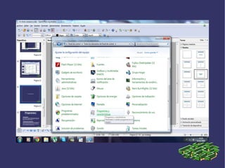 El documento describe varios aspectos del entorno de Windows como el fondo de pantalla, salvapantallas y pantalla de inicio. Explica cómo cambiar la fuente y cómo instalar, desinstalar y crear archivos comprimidos de programas. También cubre cómo verificar el disco duro, montar dispositivos y comprobar la impresora. Por último, discute las propiedades de red, los tipos de usuarios y la instalación de Spotify.