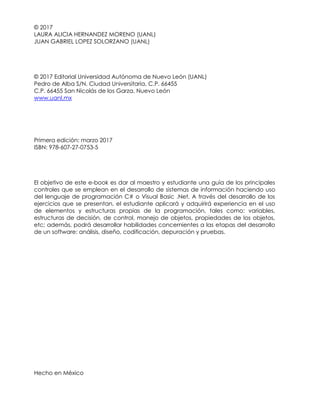 Este documento presenta una guía de laboratorios para el uso de controles en el desarrollo de sistemas de información usando C# o Visual Basic .NET. Incluye temas como formularios, TextBox, Label, Button, RadioButton, CheckBox, ComboBox, ListBox y otros controles. Cada laboratorio contiene secciones con cuestionarios, ejercicios prácticos, investigación e ideas para desarrollar. El objetivo es que los estudiantes aprendan a aplicar elementos básicos de programación como variables, estructuras de decisión, manejo de objet