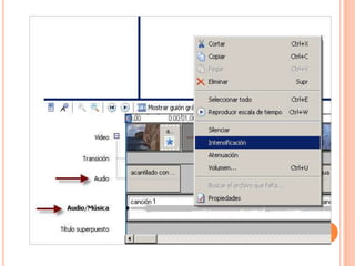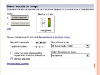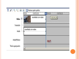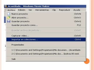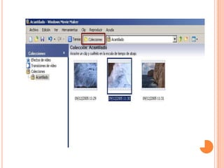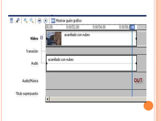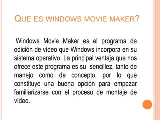 Este documento proporciona una guía sobre cómo usar el programa Windows Movie Maker para editar videos. Explica los elementos básicos de la interfaz como la línea de tiempo, paneles y barras de herramientas. También describe cómo importar clips de video y audio, editarlos mediante cortes y transiciones, añadir títulos y efectos, y exportar el video finalizado.