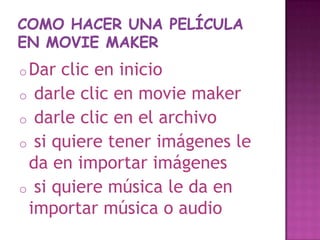 Este documento proporciona instrucciones para crear un video con Movie Maker, incluyendo cómo importar imágenes, música y audio; agregar efectos, secuencias y títulos; grabar voz en off; y guardar el video en el equipo, CD, correo electrónico o web. Explica los pasos básicos para crear y editar un video, como seleccionar archivos, añadir elementos multimedia, establecer el orden y guardar el proyecto final.