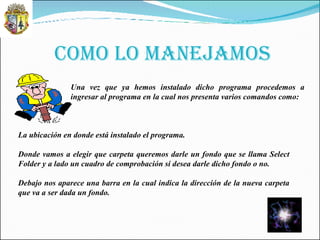 Este programa permite aplicar imágenes de fondo a las carpetas para darles un mejor estilo visual. Una vez instalado, permite seleccionar una carpeta, elegir una imagen de fondo para ella, y opcionalmente cambiar el color del fondo o del texto dentro de la carpeta. El programa guía al usuario a través de los pasos para aplicar el fondo seleccionado a la carpeta y permite cambiar el fondo existente o salir del programa.