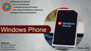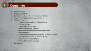Este documento resume los conceptos clave de Windows Phone. Explica que Windows Phone es el sucesor de Windows Mobile desarrollado por Microsoft. Detalla las principales versiones comerciales de Windows Phone, incluyendo Windows Phone 7, 8, 8.1 y 10 Mobile. También describe conceptos como procesos y hilos, los estados de los procesos, y cómo la planificación de procesos ayuda a garantizar una interfaz fluida para el usuario.