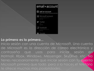 Una vez iniciada la sesión, el usuario puede descargar aplicaciones, música y juegos; crear copias de seguridad de la configuración del teléfono; y jugar juegos de Xbox y acceder a cuentas de redes sociales directamente desde el teléfono. El documento también describe cómo personalizar la pantalla de bloqueo, elegir temas y tonos, y configurar copias de seguridad y la función "Encontrar mi teléfono" para recuperar el dispositivo en caso de pérdida o robo.