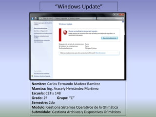El documento describe cómo acceder a Windows Update en Windows para instalar actualizaciones de software de manera automática o manual. Explica que se debe ir a Inicio, Panel de control, Sistema y seguridad y hacer clic en Windows Update, donde se pueden configurar las actualizaciones y su modo de instalación.