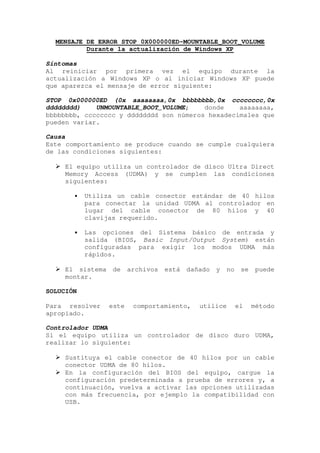 Este documento discute varios errores comunes que ocurren en Windows XP y sus soluciones. Explica cómo solucionar errores como "STOP 0x000000ED", "Archivo Boot.ini no válido", y daños en el disco duro mediante el uso de herramientas como chkdsk, bootcfg y ScanDisk. También proporciona pasos para resolver problemas de inicio como "NTLDR faltante" y mensajes de error de desbordamiento de pila mediante la modificación de Config.sys y la eliminación de programas TSR y conflictos de hardware.