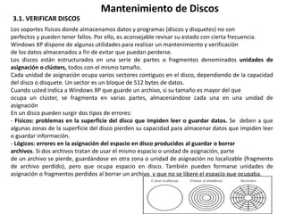Windows XP incluye herramientas para verificar y reparar errores en los discos, como la comprobación de errores y el comando chkdsk. chkdsk examina el espacio en disco y muestra un informe de errores y cómo corregirlos. Windows XP también incluye un desfragmentador de discos para optimizar el rendimiento moviendo los archivos fragmentados de manera contigua. El sistema de archivos NTFS es el recomendado para Windows XP, ya que ofrece mayor seguridad, compatibilidad con discos grandes y mejores prestaciones que FAT y FAT