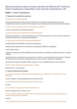 Este documento presenta los resultados de algunas prácticas realizadas sobre el sistema operativo Windows XP por parte de varios estudiantes. La primera parte, realizada por Andrii Yurashkevych, incluye preguntas sobre conceptos básicos de sistemas operativos y tareas como crear y eliminar cuentas de usuario. La segunda parte, hecha por Ángel Alfaro, describe ejercicios prácticos sobre el escritorio como seleccionar iconos y crear accesos directos. La tercera parte presenta ejercicios adicionales