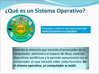 Un sistema operativo es el software fundamental que controla los recursos de un computador y permite la interacción con los usuarios. Proporciona interfaces gráficas, administra la memoria, los archivos y los dispositivos. Los tres sistemas operativos principales son Windows, macOS y Linux.