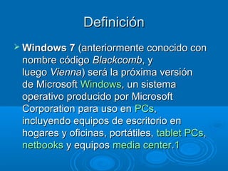 Windows 7 es la próxima versión del sistema operativo Windows de Microsoft. Sus objetivos principales son mejorar la interfaz para hacerla más amigable al usuario, mejorar el rendimiento, y asegurar una transición transparente desde Windows Vista. Algunas de sus nuevas características incluyen mejoras en el reconocimiento de voz y táctil, soporte multi-touch, mejor desempeño en procesadores multi-núcleo y una interfaz rediseñada.
