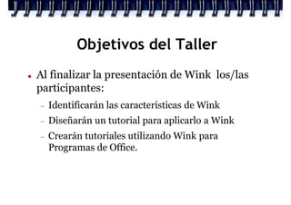 Wink es un programa freeware que permite crear tutoriales interactivos mediante la grabación de la pantalla y las acciones del usuario. Los tutoriales creados con Wink pueden exportarse a diferentes formatos como Flash, PDF y HTML. El programa soporta la inserción de imágenes, sonido y botones en los tutoriales. Wink es una herramienta gratuita que puede utilizarse para fines educativos no comerciales como la creación de tutoriales para programas de Office.