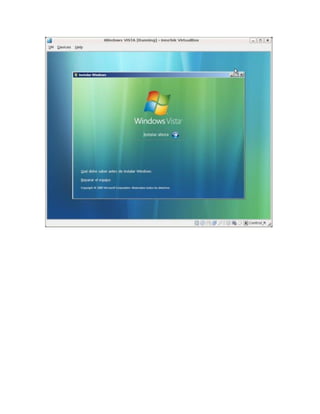 Este documento presenta los pasos para instalar Windows Vista en una máquina virtual usando VirtualBox, incluyendo la instalación de VirtualBox, la creación de una nueva máquina virtual, la asignación de recursos como memoria y espacio en disco, y la guía detallada para completar la instalación de Windows Vista dentro de la máquina virtual recién creada. El propósito es enseñar a los estudiantes cómo instalar y usar máquinas virtuales de una manera fácil y rápida para poder ejecutar múltiples sistemas oper