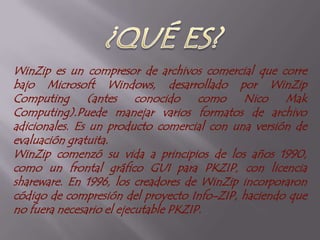 WinZip es un compresor de archivos comercial desarrollado por WinZip Computing que puede manejar varios formatos de archivo. Comenzó como un frontal gráfico para PKZIP y ahora incluye su propio código de compresión. WinZip comprime y descomprime archivos rápidamente para ahorrar espacio en disco y reducir el tiempo de transmisión de correos electrónicos. Existen versiones Standard y Pro con diferentes características como automatización de tareas y soporte para archivos adjuntos potencialmente peligrosos.