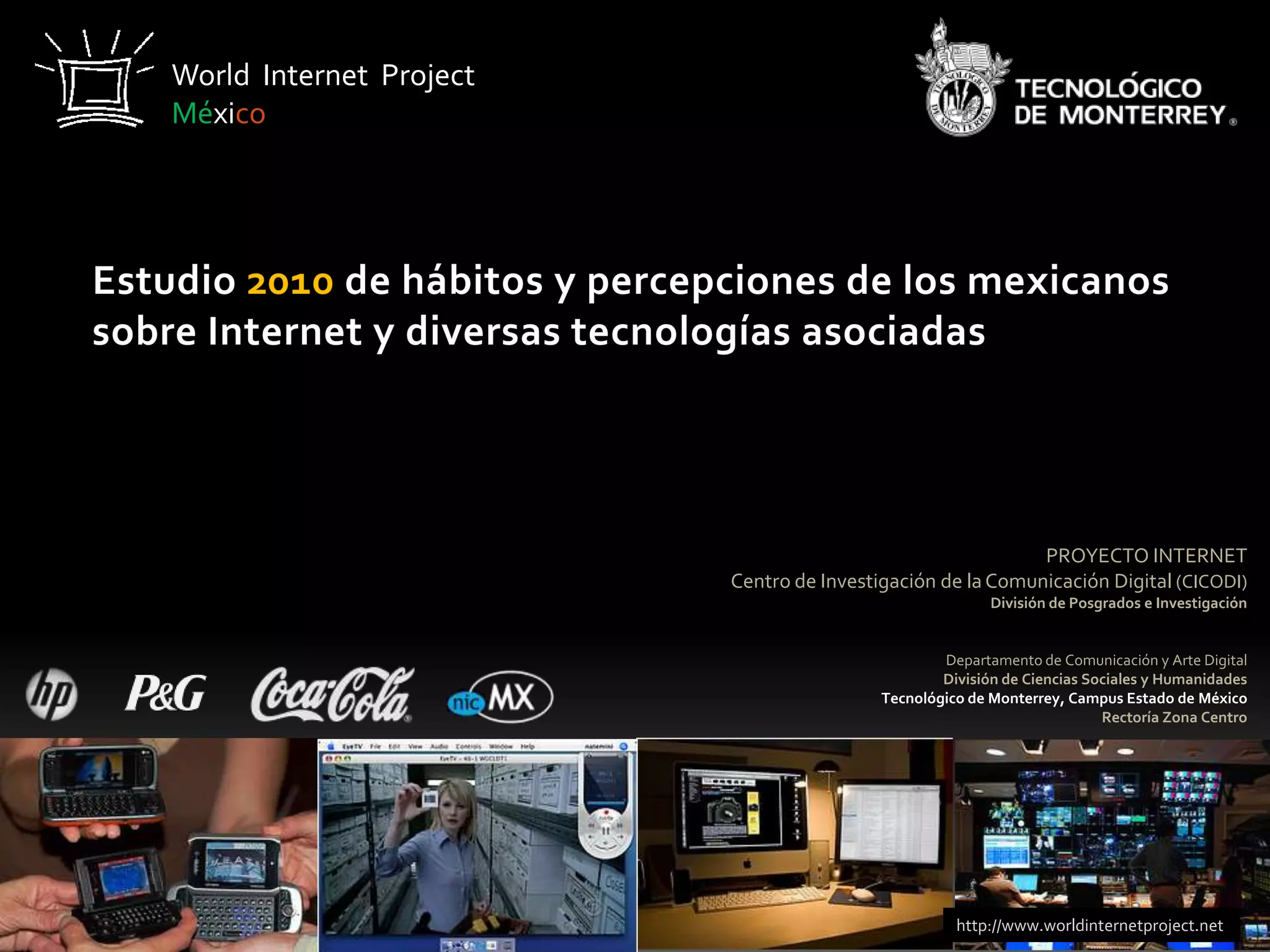 El documento presenta los resultados del Estudio 2010 del Proyecto Internet México sobre los hábitos y percepciones de los mexicanos respecto a Internet y tecnologías asociadas. El estudio encontró que la penetración de Internet en México aumentó un 3% en 2010, con más de 30 millones de usuarios. Los usuarios se conectan principalmente desde el trabajo y el hogar, y usan Internet principalmente para revisar correo electrónico y redes sociales. Aunque las compras en línea aún son bajas, Internet es un medio importante para obtener información sobre product