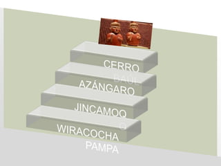 Este documento resume varios sitios arqueológicos en la región de Huamachuco y sus características asociadas con las culturas Wari y Tiwanaku entre los periodos 1B y 2B. Wiracochapampa muestra evidencia de la presencia Wari pero no dominio estatal total. En Jincamoqo se modificaron los patrones de asentamiento e intensificó la producción de maíz. Azángaro era un sitio ceremonial con 340 pequeñas edificaciones que probablemente fue gobernado de manera recíproca. El Cerro Ba