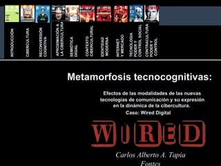 Este documento trata sobre los efectos de las nuevas tecnologías de comunicación y su expresión en la dinámica de la cibercultura. Explora conceptos como la semiótica digital, la identidad moderna, la reconversión cognitiva y el poder y control social en el contexto de Internet y el mercado. Analiza cómo la cibercultura cuestiona lo real a través de la escritura electrónica, el cuerpo físico y social, y cómo esto afecta la forma en que conocemos y significamos las cosas.