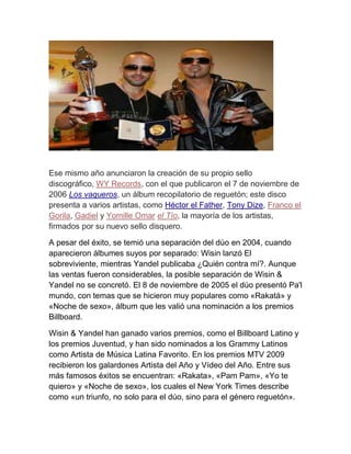 Wisin & Yandel se formaron en 1998 y lanzaron varios álbumes exitosos entre 2000 y 2003 que recibieron certificaciones de oro. A pesar de sus éxitos conjuntos, en 2004 lanzaron álbumes en solitario que también tuvieron ventas considerables. Más tarde negaron rumores de separación y continuaron colaborando, aunque en 2014 lanzaron nuevos álbumes individuales y confirmaron una separación temporal con la promesa de volver a unirse en 2016.