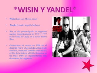 Wisin y Yandel son un exitoso dúo de reggaetón puertorriqueño formado en 1998 que ha tenido una larga y exitosa carrera musical juntos. Han lanzado numerosos álbumes de estudio y recopilatorios que les han valido múltiples discos de oro y platino. Se les considera entre los máximos representantes del género del reggaetón.
