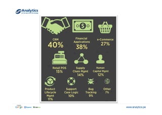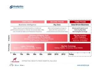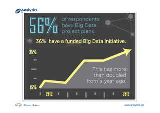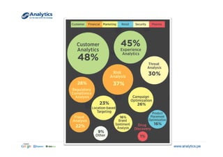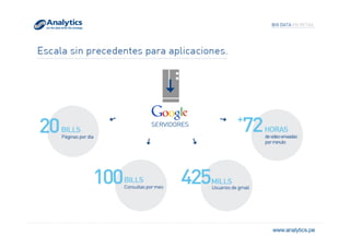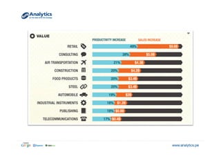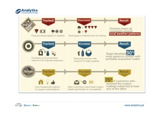 El documento explora el concepto de big data y su relevancia en la toma de decisiones empresariales, destacando ejemplos de empresas que han utilizado datos analíticos para mejorar la rentabilidad y la experiencia del cliente. Se menciona la evolución del volumen y tipo de datos generados, así como aplicaciones prácticas que ilustran cómo diversas industrias pueden beneficiarse de su análisis. Finalmente, se discuten estrategias de segmentación y marketing dirigidas basadas en la comprensión profunda del comportamiento del consumidor.