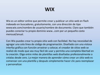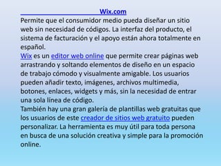 Wix es un editor web online gratuito que permite a los usuarios crear sitios web arrastrando y soltando elementos de diseño sin necesidad de código. Los usuarios pueden elegir entre plantillas pre-diseñadas o crear sus propios diseños personalizados. Wix también ofrece hosting gratuito y ahora su interfaz, facturación y soporte técnico están disponibles completamente en español.