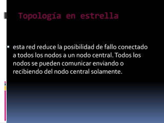 El documento describe cuatro tipos principales de topologías de red: estrella, árbol, anillo y bus. La topología en estrella conecta todos los nodos a un nodo central, la topología en árbol tiene nodos individuales que se comunican con un solo nodo, la topología en anillo pasa la comunicación de nodo en nodo de manera secuencial, y la topología de bus permite que todos los dispositivos vean las señales de los demás.