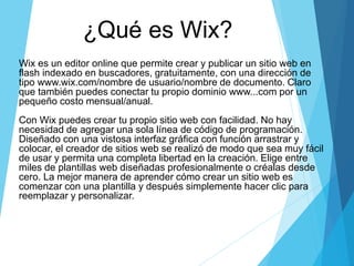 Wix es un editor online gratuito que permite crear sitios web sin necesidad de código. Los usuarios pueden publicar sus sitios en un dominio wix.com o conectar su propio dominio por un pequeño costo. Wix ofrece plantillas de diseño profesional que los usuarios pueden personalizar fácilmente arrastrando y soltando elementos. El proceso de creación incluye registrarse, seleccionar una plantilla, y editarla mediante un video tutorial interactivo.