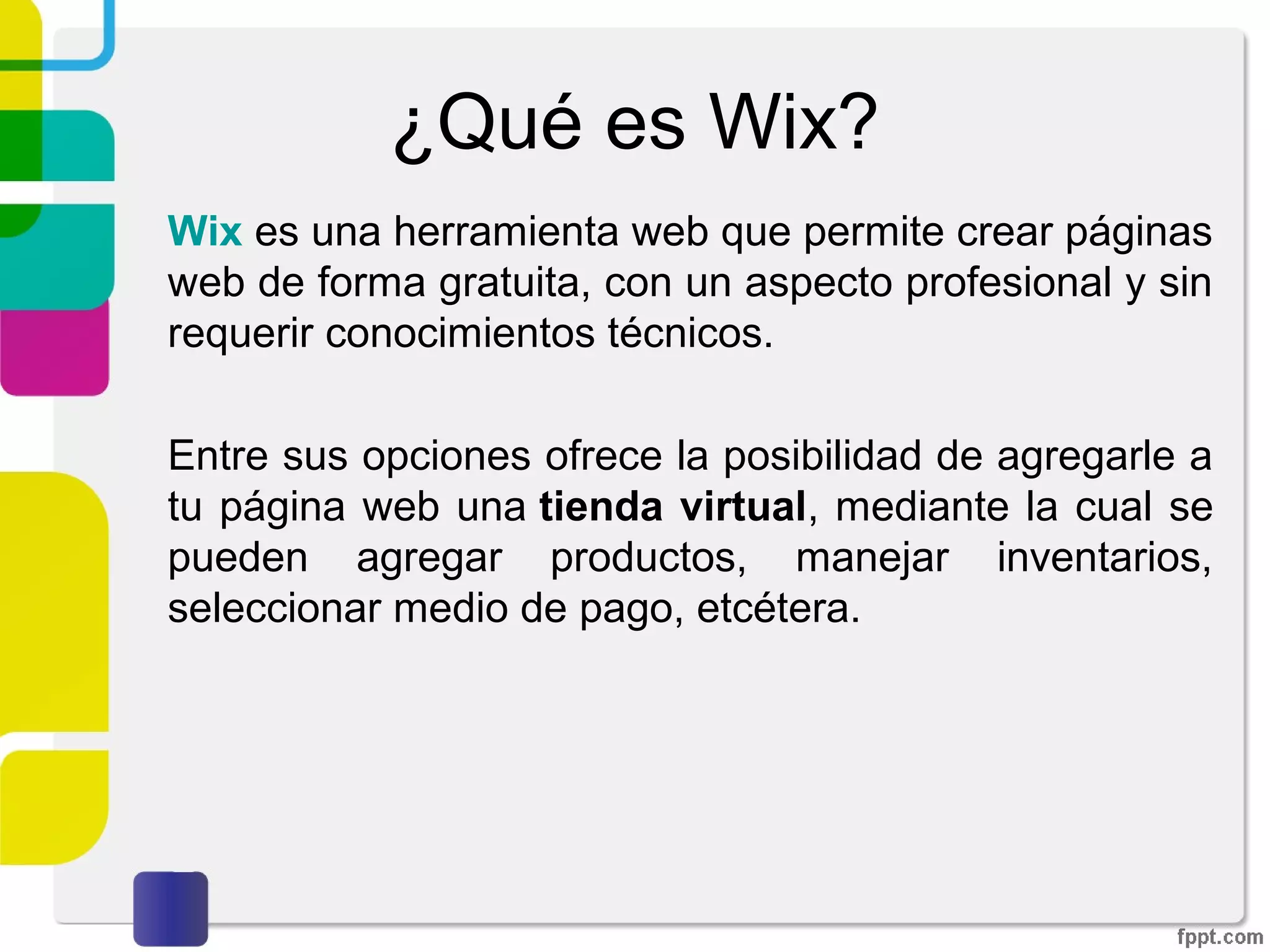 Wix es una herramienta web gratuita que permite crear páginas web profesionales sin conocimientos técnicos. Ofrece opciones para agregar una tienda virtual donde se pueden añadir y administrar productos y pagos. El documento explica el proceso de seleccionar una plantilla y categoría, agregar diferentes elementos como fondos, texto e imágenes a las páginas mediante una barra lateral de edición, y publicar el sitio para obtener una URL.