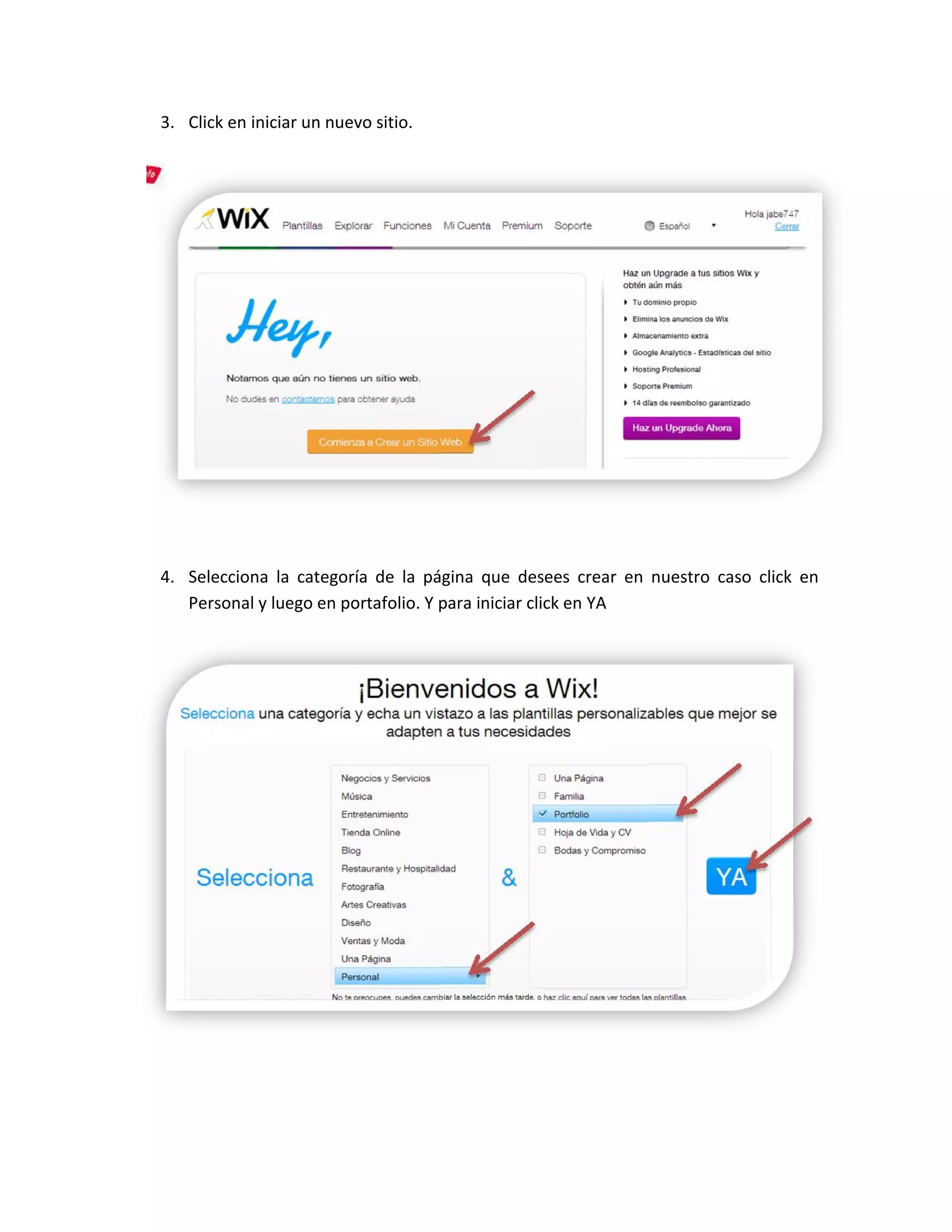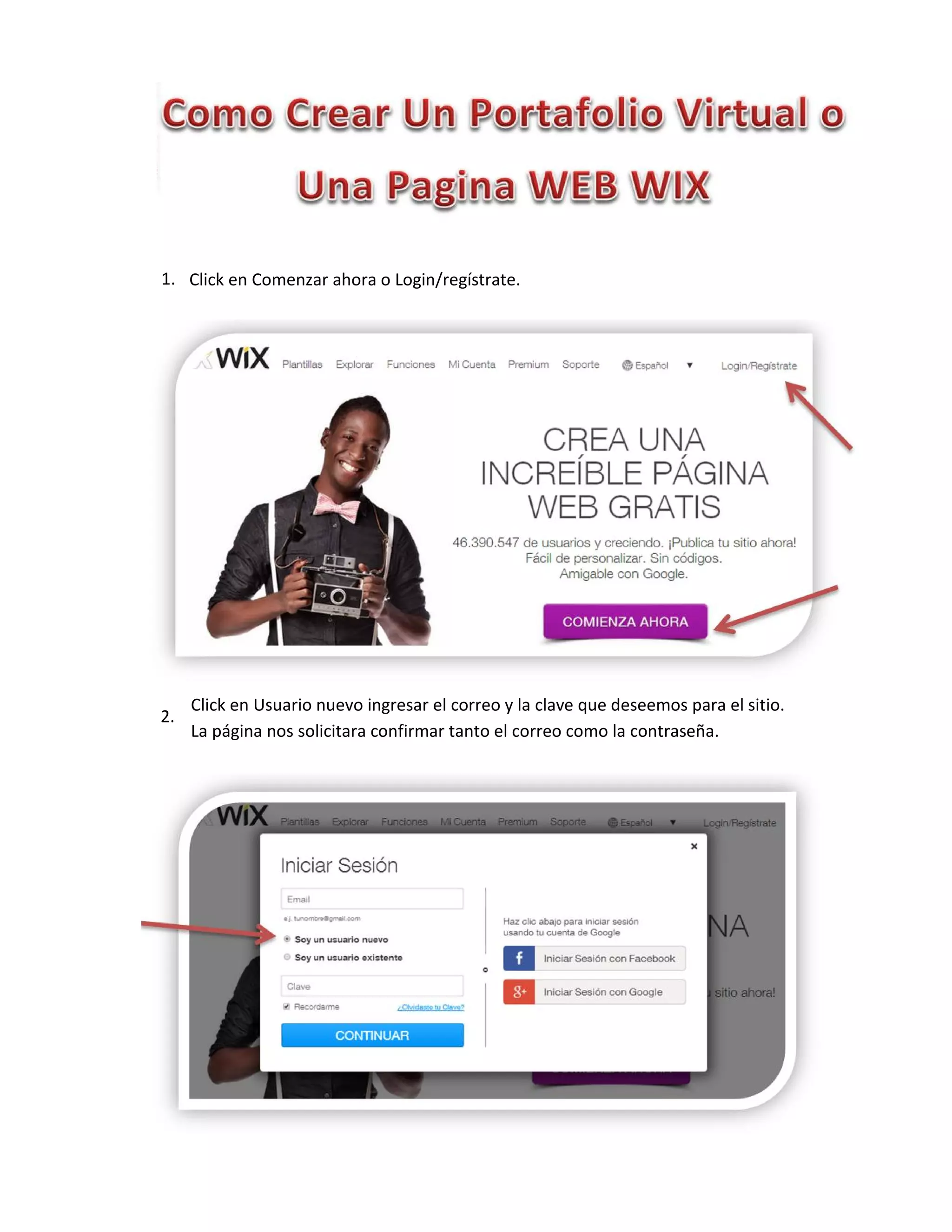 Este documento proporciona instrucciones para crear un sitio web de portafolio personal utilizando la plataforma Wix. Explica los 13 pasos para registrarse, seleccionar una plantilla, personalizar el menú principal, agregar páginas y contenido como imágenes, y publicar el sitio web para que esté disponible en Internet.