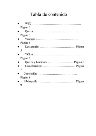 Wix y Yola son plataformas en línea gratuitas que permiten crear sitios web de forma sencilla y sin necesidad de conocimientos de codificación. Wix ofrece plantillas y herramientas de edición para personalizar sitios, mientras que Yola se enfoca en la facilidad y rapidez de creación. Ambas son opciones flexibles pero Wix presenta más anuncios y no permite cambiar plantillas sin perder contenido.