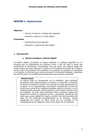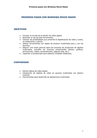 Este documento proporciona instrucciones para los primeros pasos con el programa Windows Movie Maker, incluyendo objetivos de aprendizaje, contenidos clave y sesiones guiadas sobre digitalización de video, edición básica, recorte de escenas, titulación y transiciones. Las sesiones guían al usuario paso a paso a través del proceso de captura de video, edición, agregación de títulos y transiciones para crear un proyecto de película básico.