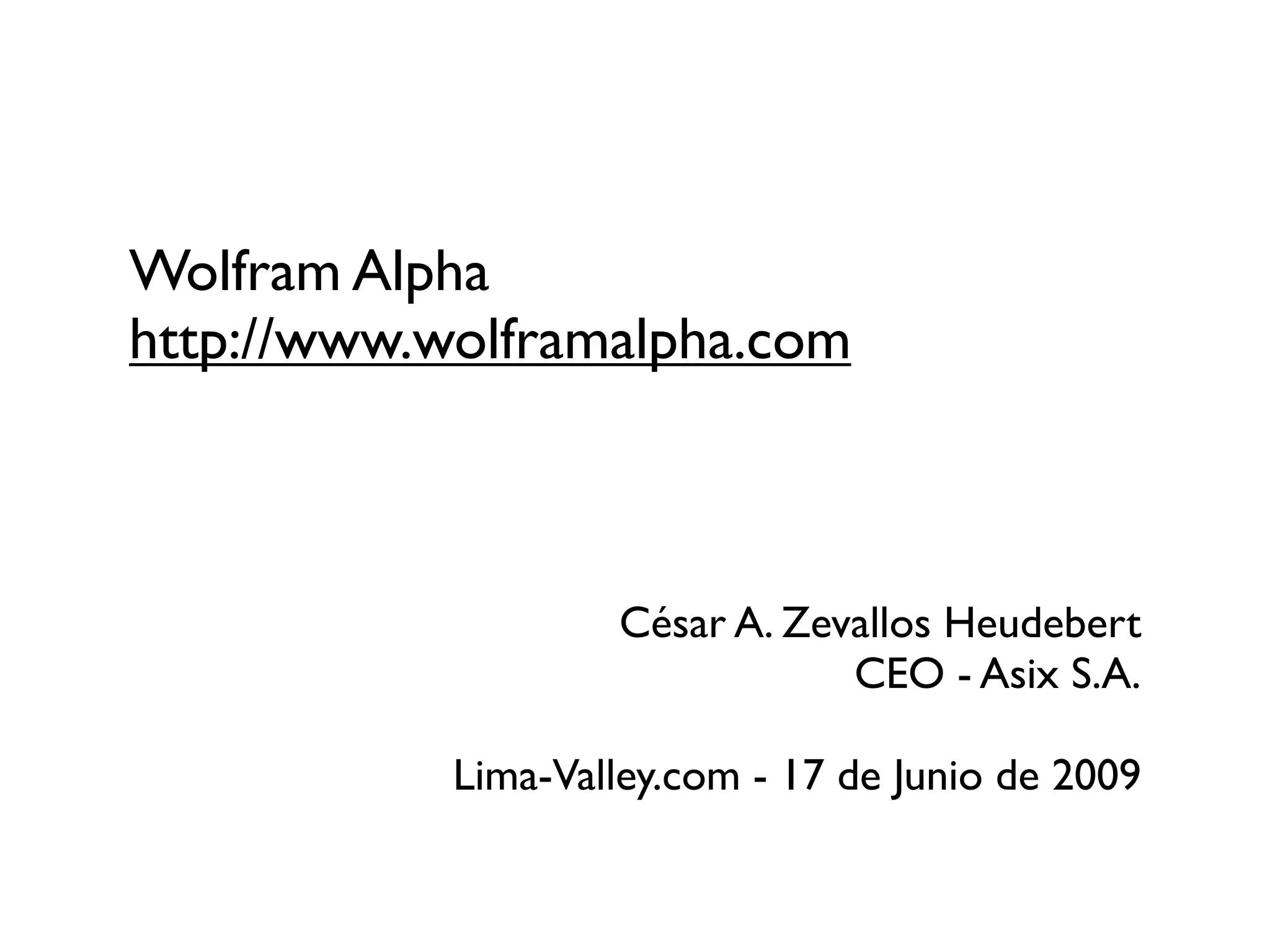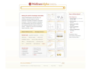 Wolfram Alpha es un motor de conocimiento computacional lanzado en 2009 que computa respuestas nuevas a preguntas mediante algoritmos en lugar de almacenar datos. Proporciona respuestas a preguntas en varias áreas como matemáticas, ciencias y definiciones mediante el uso de algoritmos computacionales, datos curados y procesamiento lingüístico. Fue creado por el físico teórico Stephen Wolfram y está basado en su software Mathematica.