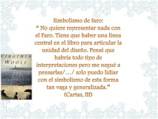 1. El documento presenta información biográfica sobre la escritora Virginia Woolf, incluyendo detalles sobre su familia, obras literarias publicadas y suicidio. 2. También describe el Modernismo inglés como un movimiento literario que buscaba romper con las convenciones victorianas y manipular formas para representar la realidad del siglo XX. 3. Finalmente, analiza la novela The Waves de Woolf, resaltando su estructura dual de discursos paralelos sobre el fluir del tiempo y las voces entrelazadas de seis