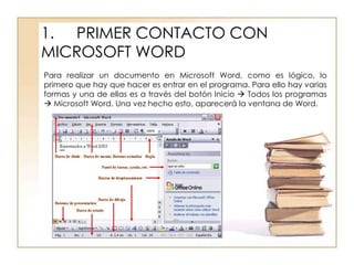 Este documento proporciona una introducción a las funciones básicas de Microsoft Word, incluyendo cómo abrir y guardar documentos, seleccionar y editar texto, usar los menús y barras de herramientas, y aplicar formatos y correcciones ortográficas/gramaticales. Explica las vistas y modos de presentación disponibles, y cómo acceder a ayuda y documentación dentro del programa.