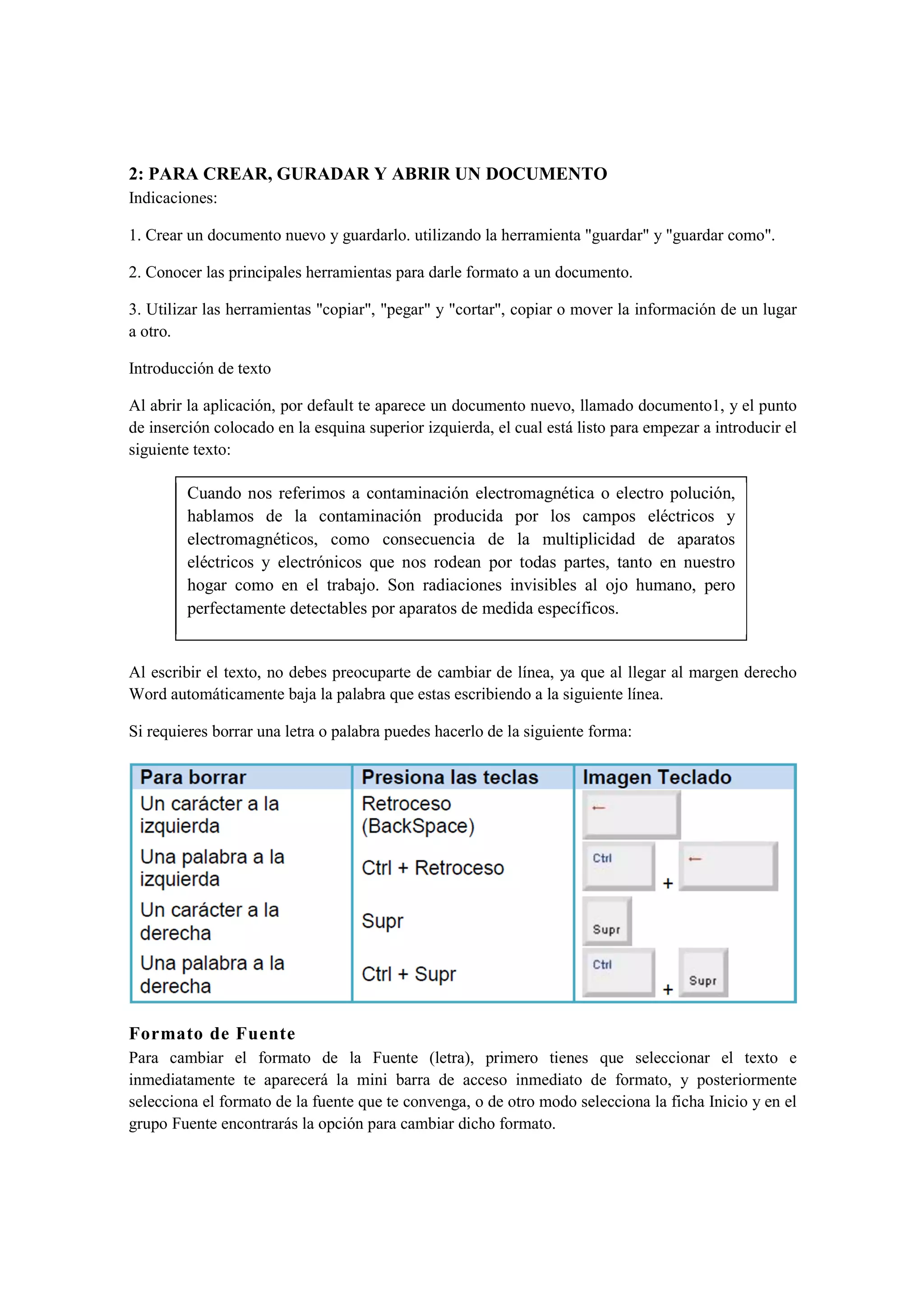 Este documento proporciona instrucciones sobre cómo crear, guardar y abrir documentos en Word, así como cómo dar formato a texto y párrafos mediante la selección de fuentes, estilos, alineación y espaciado. También explica cómo copiar, cortar y pegar texto dentro de un documento utilizando las herramientas del portapapeles y ratón.