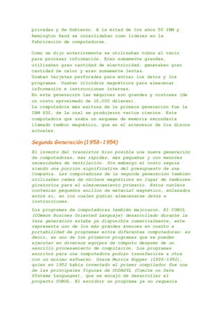 El documento describe las diferentes generaciones de computadoras desde la primera generación en 1951 hasta la quinta generación actual. Cada generación se caracteriza por avances tecnológicos como el uso de transistores, circuitos integrados y microprocesadores que hicieron posible computadoras más pequeñas, rápidas y potentes. La quinta generación se enfoca en procesamiento paralelo e inteligencia artificial.
