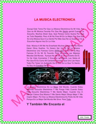 El documento habla sobre la música electrónica y cómo es la música favorita del autor. Explica que a pesar de que a algunos no les gusta por su ritmo repetitivo, cree que a la gente eventualmente le gustará. La música electrónica le ha enseñado cosas y le ha inspirado a querer ser un DJ famoso como Skrillex. También dice que la escucha cuando está feliz o triste para sentirse mejor.