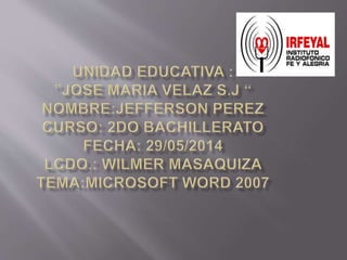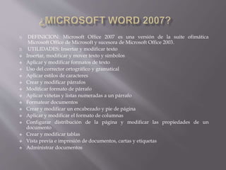 Microsoft Office 2007 es la versión sucesora de Microsoft Office 2003 que permite a los usuarios crear y editar documentos, incluyendo la inserción y modificación de texto, la aplicación de formatos, la creación de tablas y la vista previa e impresión de documentos. Ofrece también utilidades para administrar documentos y cuenta con barras de herramientas y opciones para facilitar su uso.