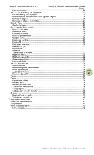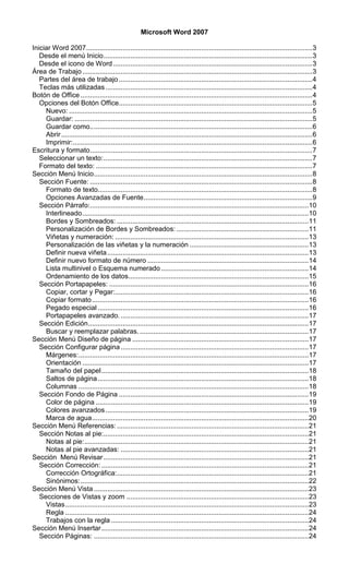El documento es un manual sobre el uso de Microsoft Word 2007, que detalla desde cómo iniciar el programa hasta las funciones de edición y formato de texto. Incluye secciones sobre características como el manejo del botón de Office, selección de texto, interlineado, viñetas, numeración, y opciones avanzadas de formato. Proporciona instrucciones claras, así como la descripción de las partes del área de trabajo y el uso de diversas herramientas básicas y avanzadas del software.