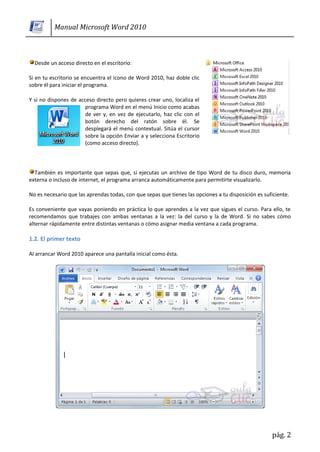 Este manual explica cómo usar Microsoft Word 2010. Enseña cómo crear y guardar un primer documento, identifica los elementos clave de la interfaz como la cinta de opciones y la barra de herramientas, y explica cómo abrir y cerrar documentos y el programa.