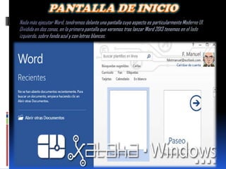 Este documento describe las diferentes opciones disponibles en el menú Archivo de Microsoft Word 2013, incluyendo la capacidad de guardar, imprimir, compartir documentos, acceder a información de cuenta y abrir archivos recientes. Explica que muchas de estas opciones muestran información organizada en dos columnas y permiten acceder a comandos o seleccionar opciones de configuración de manera directa.
